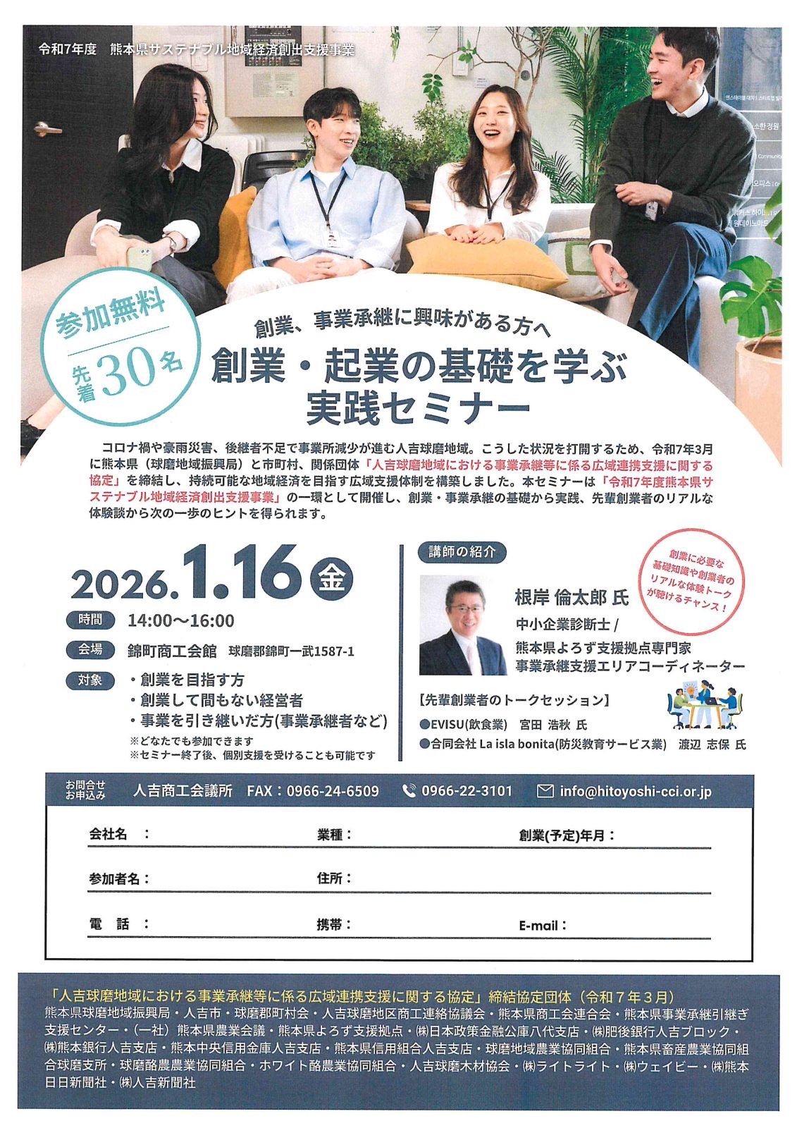 人吉球磨地域において、事業承継や新規創業を積極的に支援・促進することで、後継者不在や経営者の高齢化、令和2年7月豪雨災害等の影響により増加傾向にある廃業を抑制し、持続可能な地域経済の確立を図ることを目的とします。