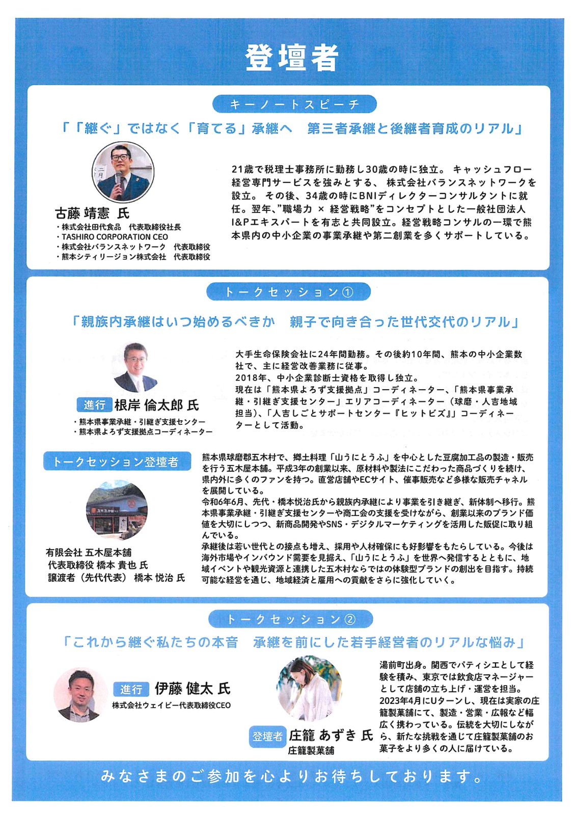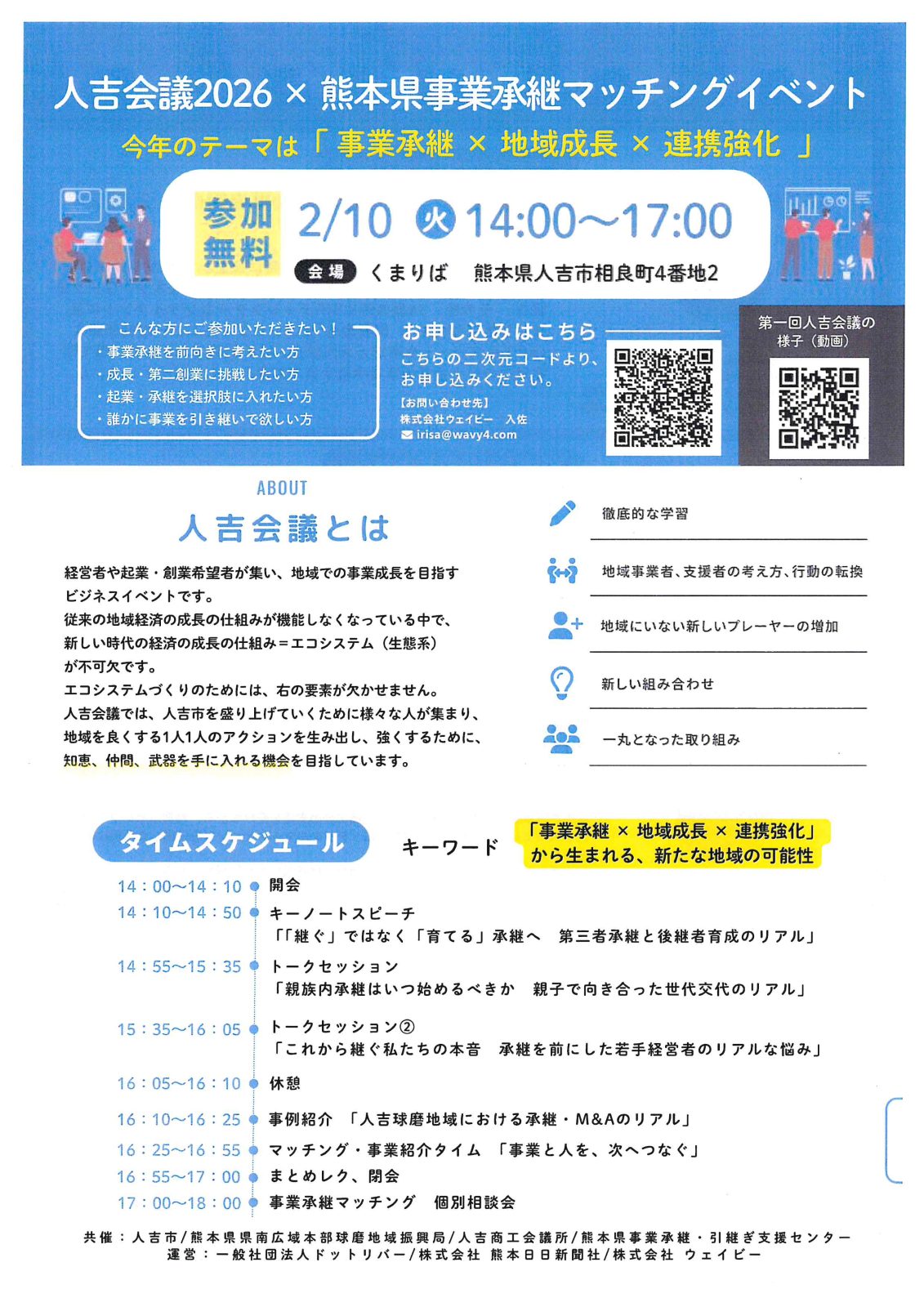 ■申込方法:別添のチラシのQRコード【人吉会議2026×熊本県事業承継マッチングイベント】 よりお申し込みください。